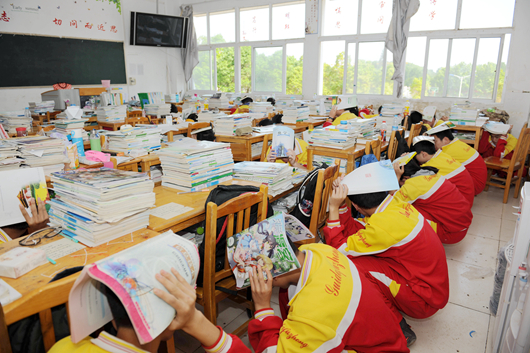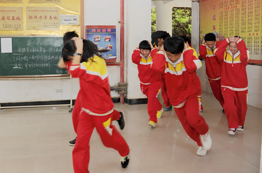 貴大新聞網訊(記者 田鑫/陳恒 攝)5月12日下午,在我校附中校內突然響起了刺耳的警報聲,正在上課的師生們聽到警報都井然有序地彎下腰、抱著頭一個接一個地跑下樓。
