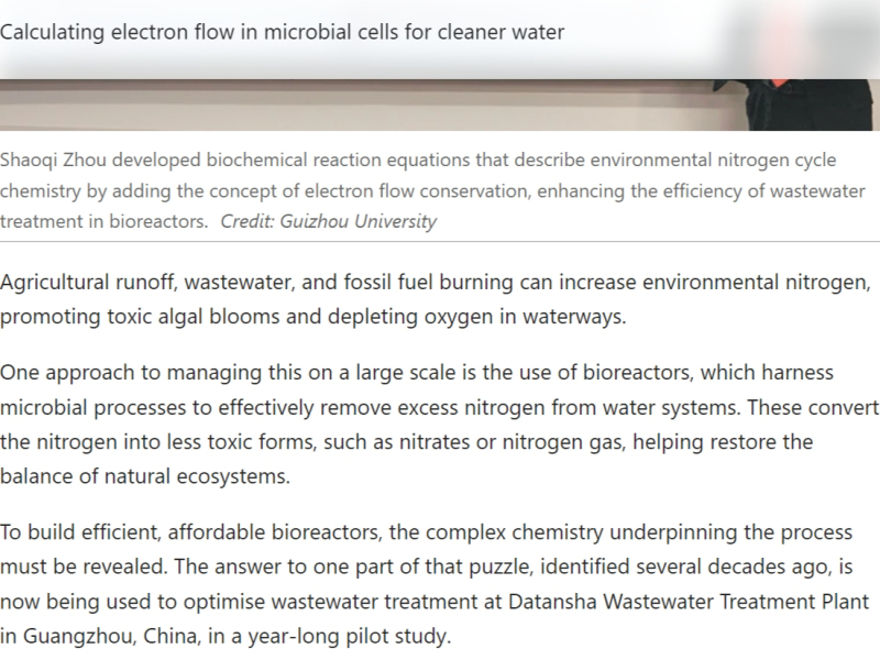 文章提到,周少奇教授“開創性地提出了更加精準分析氮、磷和COD同步去除過程的化學計量方程和計量比模型(COD/N/P),詳細描述了所謂的反硝化除磷菌(DPB)如何去除營養物質。這一成果基于他在‘電子計量學’領域的開創性研究。這種原創方法通過在化學計量方程研究中分析分子間的電子遷移來精準描述化學反應”。