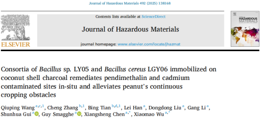 貴大新聞網訊(農學院)近日,我校師生在國際著名學術期刊Journal of Hazardous Materials(IF=12.2)在線發表了題為“Consortia of Bacillus sp. LY05 and Bacillus cereus LGY06 immobilized on coconut shell charcoal remediates pendimethalin and cadmium contaminated sites in-situ and alleviates peanut’s continuous cropping obstacles”的研究論文。團隊將Bacillus sp. LY05和B. cereus LGY06固定在椰殼炭上,建立了椰殼炭固定化混合菌群,該固定化菌群能同時緩解花生二甲戊靈殘留-鎘復合污染與連作障礙。研究獲得國家重點研發計劃、國家自然科學基金、貴州省科技創新平臺建設與科技創新人才團隊等項目的資助。貴州大學貴州省農業生物安全全省重點實驗室博士生王秋萍為第一作者,副校長陳祥盛教授、吳小毛教授為共同通訊作者。