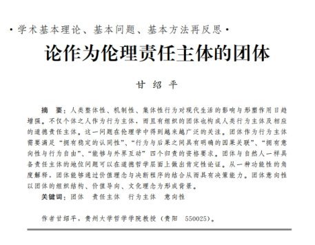 甘紹平教授在文章中指出:人類倫理學兩千年的歷史中,令人印象深刻的在于,人之個體作為道德行為主體的地位,也就是說似乎只有個體才是各種道德義務與責任類型的承擔者。然而現代社會的發展證明,團體、組織、機制的正向作用與消極后果均遠高于個體行為者,這也就決定了道德要求的實現往往不能僅僅指望個體行為動機與單獨的行動,而是要依靠社會中不同層級的集體、企業、公司、組織、機構這樣一些具有力度的整體性的行為主體的有效作為。在我國倫理學界,不僅個體,人類團體與組織也應作為行為主體以及責任承擔者的問題已經進入研究視野,并呈現為有關組織倫理、企業社會責任的系統探索的成果。在法學界,有關組織體自身的責任問題也得到廣泛的討論,單位不依賴于其組成成員的獨立的歸責模式得到了許多學者的認同。道德主體無法僅僅被限定在個體身上,對社會團體、組織、企業所應承擔的集體性的責任做出一種規范性圖景的刻畫,在厘清團體具有何種意義的意志或意向性的基礎上確立團體責任主體的地位,理所當然成為倫理學研究的對象以及當代哲學自我理解的一個不容忽視的重要環節,這一探究對于現代社會的義務歸屬與責任追究無論在倫理學還是在法學界無疑均具有重大而緊迫的理論價值與現實意義。